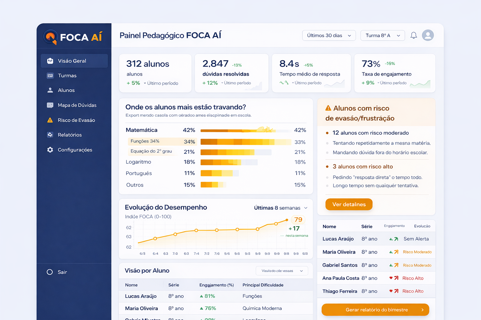 Dashboards de acompanhamento pedagógico. Leve o FOCA AI para sua rede de ensino.